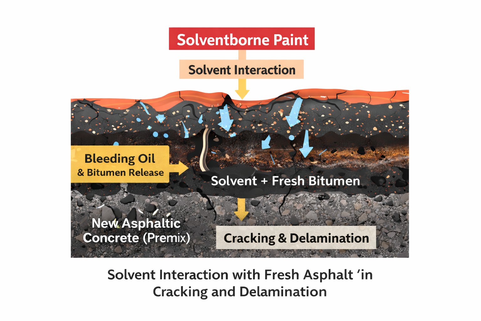 Premature failure can also happen when paint is applied too soon on freshly laid asphalt, especially with high-performance coatings such as 2-component aliphatic polyurethane (PU).